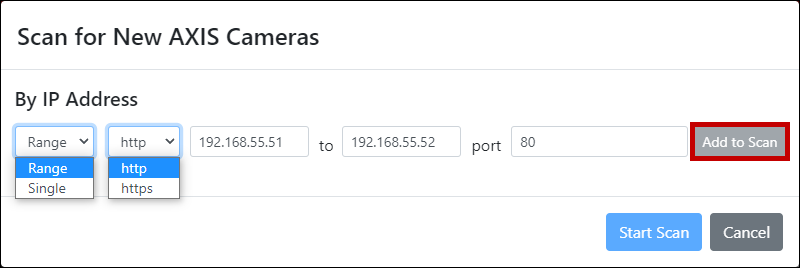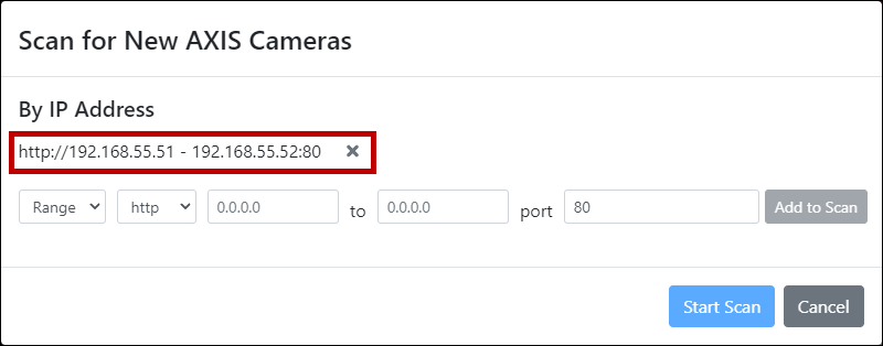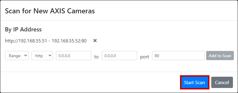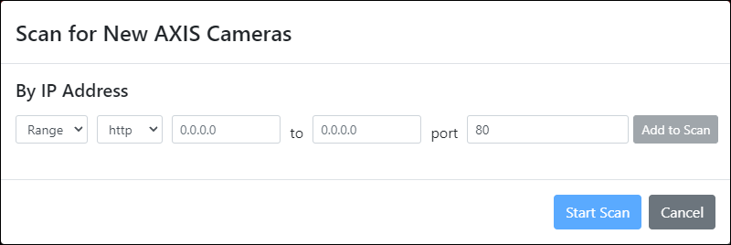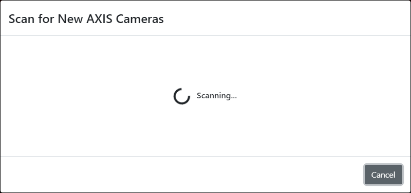 - This opens the Scan for New AXIS Cameras window, shown below.
