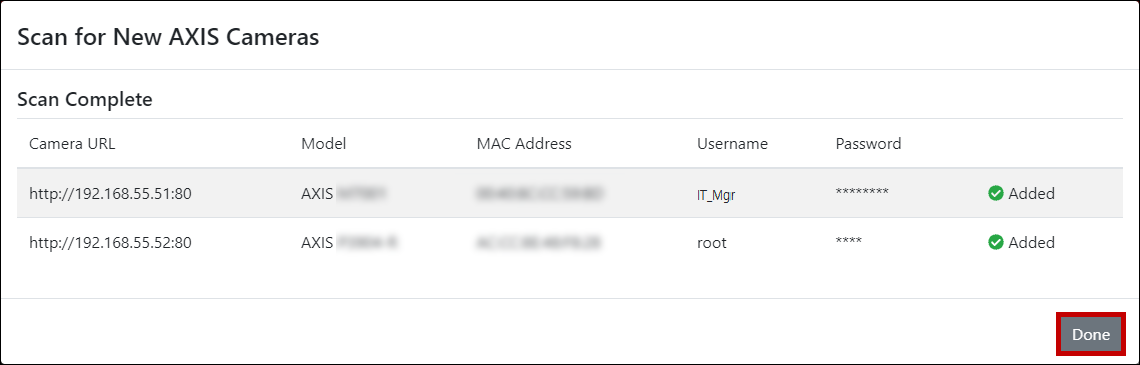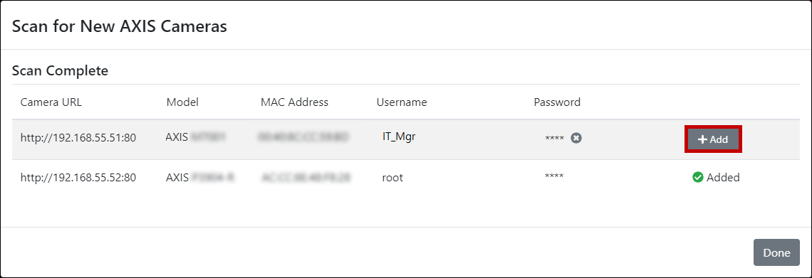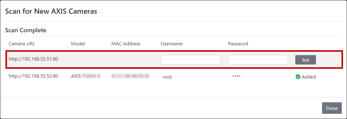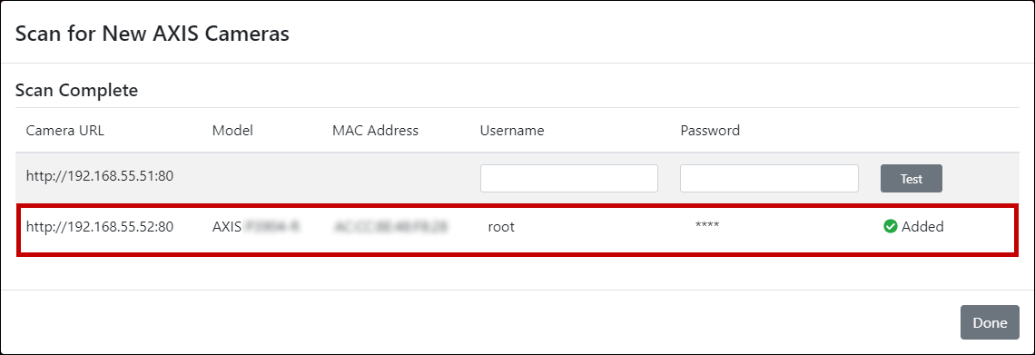 - Our scan found two Axis cameras. The first is configured with custom credentials. Therefore, its Username and Password fields are empty.