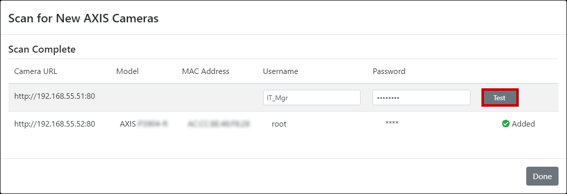- For the camera using custom credentials, we need to enter its Username and Password, and then select Test to check that the credentials are valid.