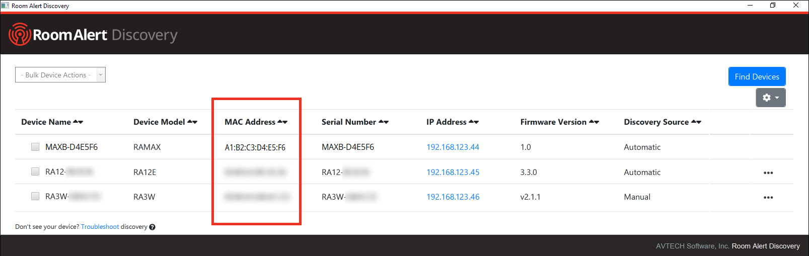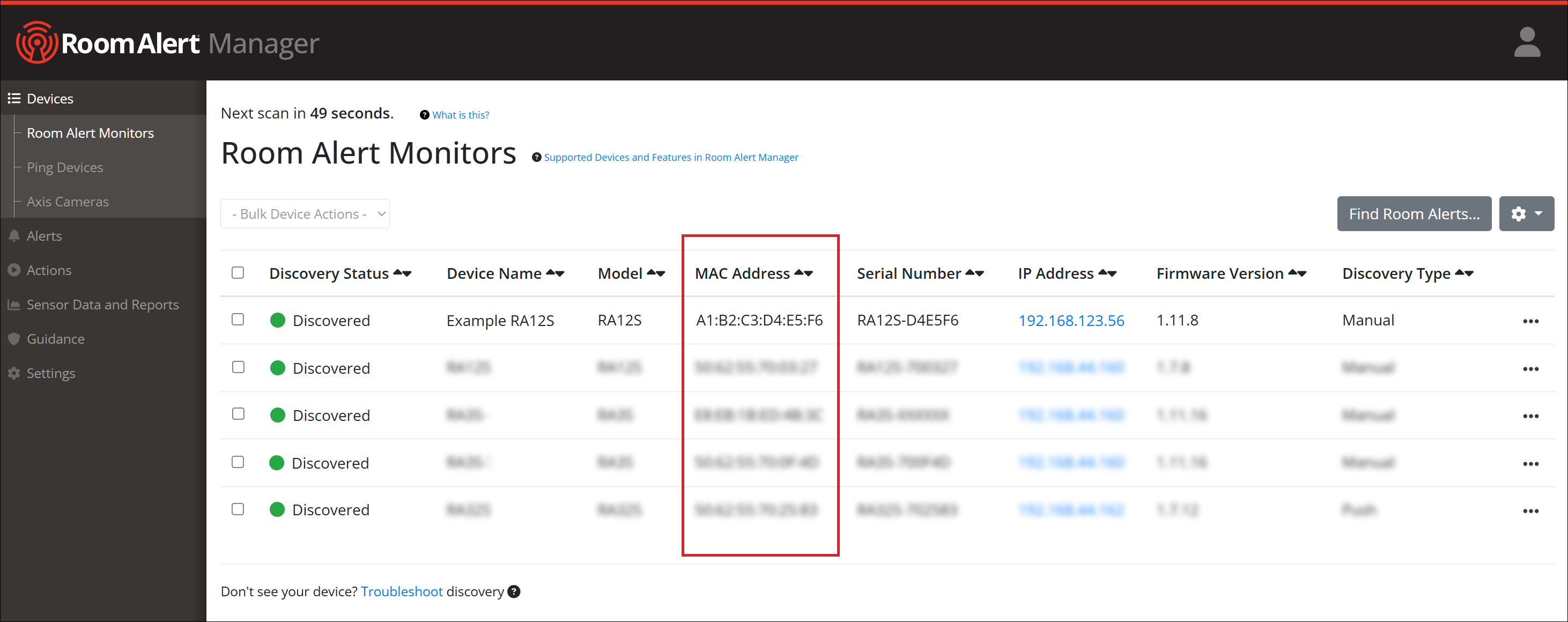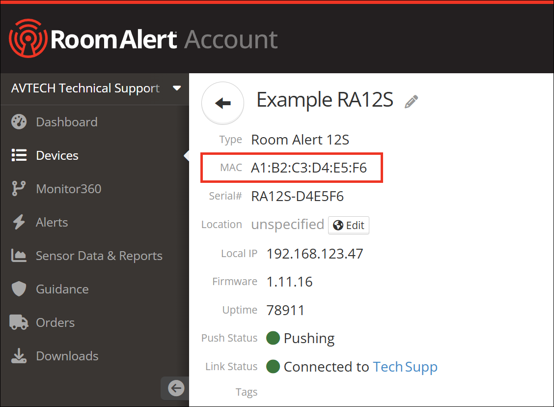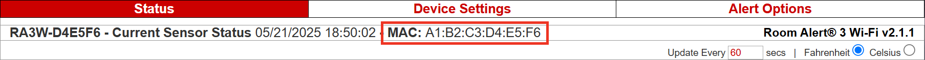 You may need the MAC address of your Room Alert Monitor to perform certain tasks, such as advanced discovery in Room Alert software.