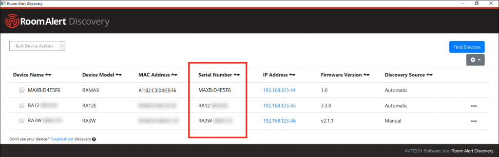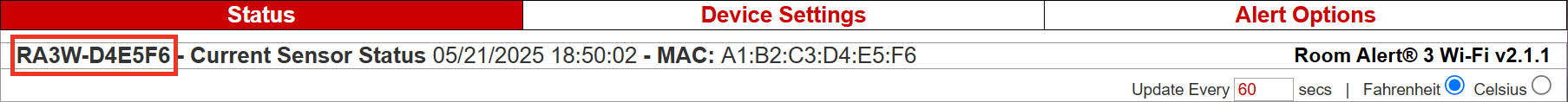 A Room Alert Monitor’s serial number is composed of a 3- to 4-character model code, a hyphen and either a 5- to 6-digit number or an alphanumeric string matching the last 6 characters of the MAC address.