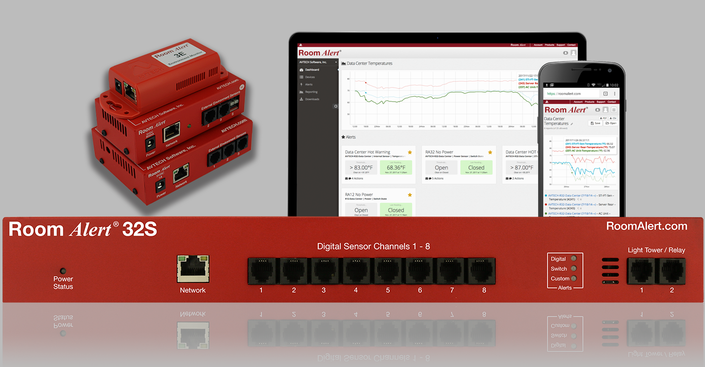 all in a monitor that has the capability to utilize over 32 external sensors. With the Room Alert 32S, even the most high security facilities are able to easily and accurately monitor all aspects of the business.