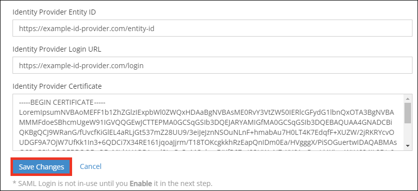 Saving these changes does NOT enable SAML SSO for the account. That’s done in a later step.