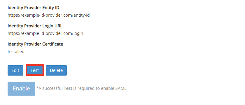 1. Once SAML has been disabled, the Edit, Test and Delete buttons become available.