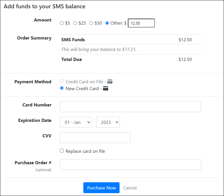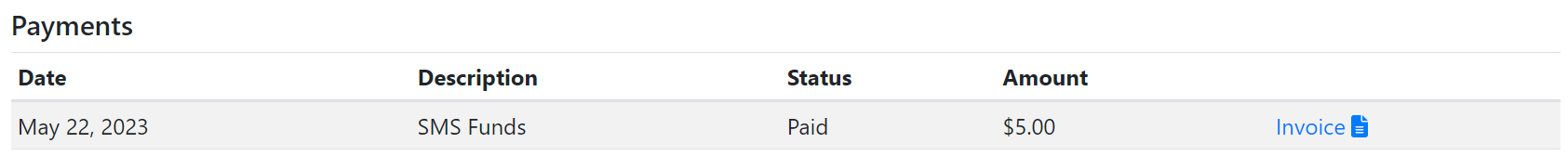 When SMS funds get added to the account, an entry is added to the Payments table. (The table does not appear if SMS funds have never been added to the account.)