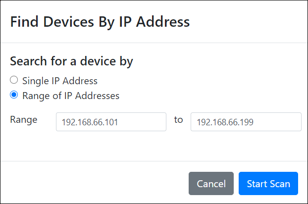 - Select Start Scan to begin scanning the single or range of IP addresses.