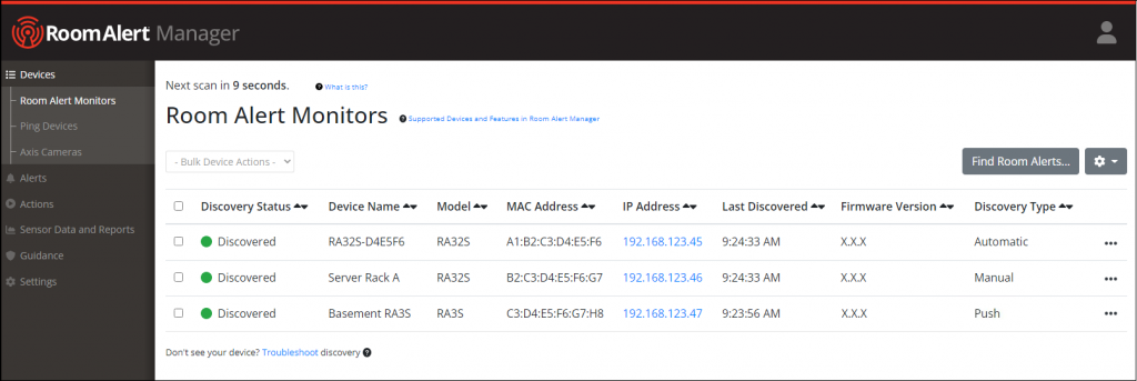 If your Room Alert 32S, 12S, 3S, 32E, 12E, 4E, 3E or 3 Wi-Fi is not automatically discovered by Room Alert Manager, you can try manually discovering the device by scanning its IP address or a range of IP addresses.