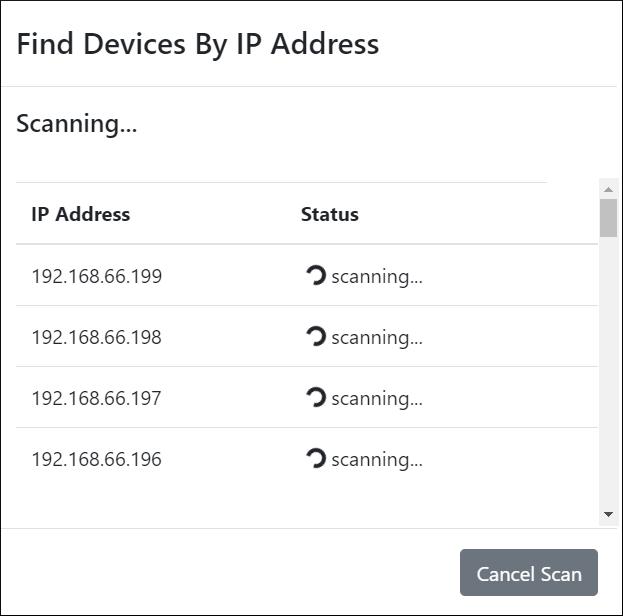 - While the scan is running, you’ll see a spinner beside each IP address, as shown below.