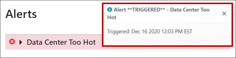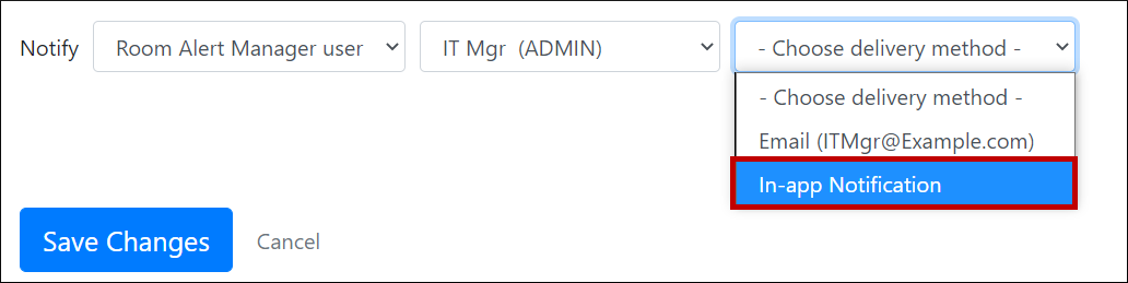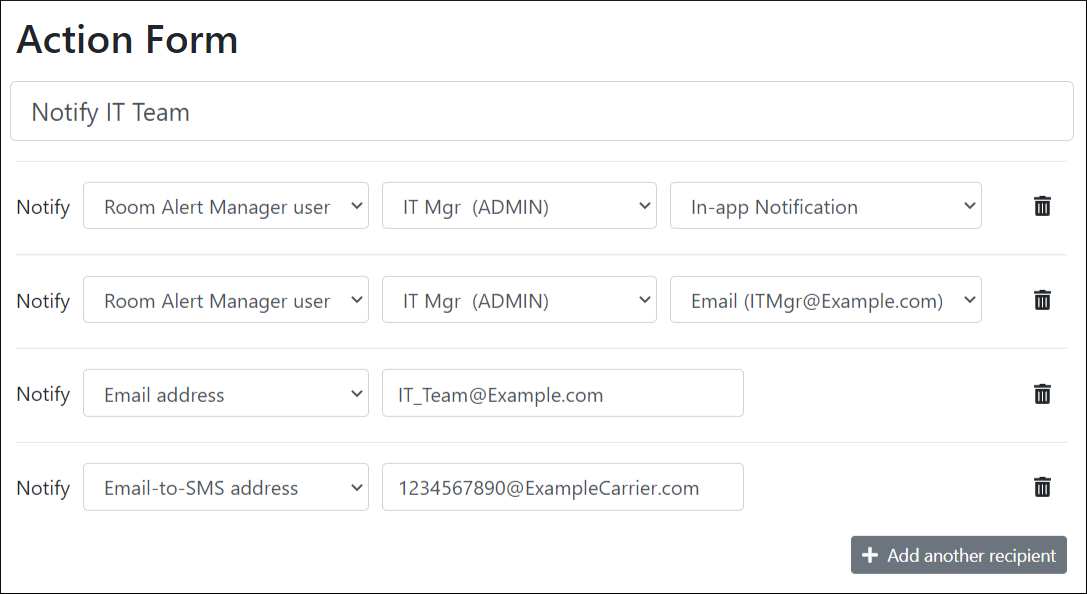 You may configure actions in Room Alert Manager to send these types of alert notifications: