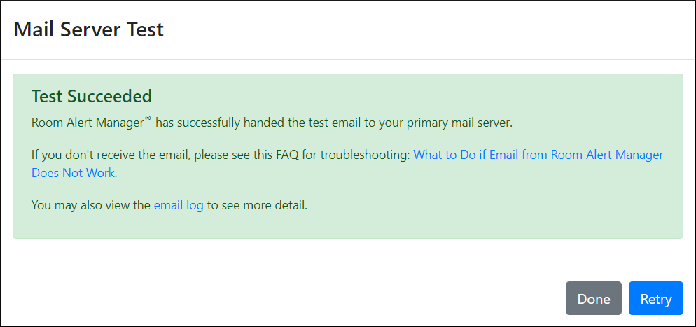 - Room Alert Manager will attempt to send a test email through your mail server.