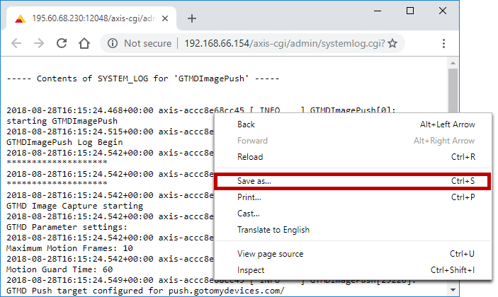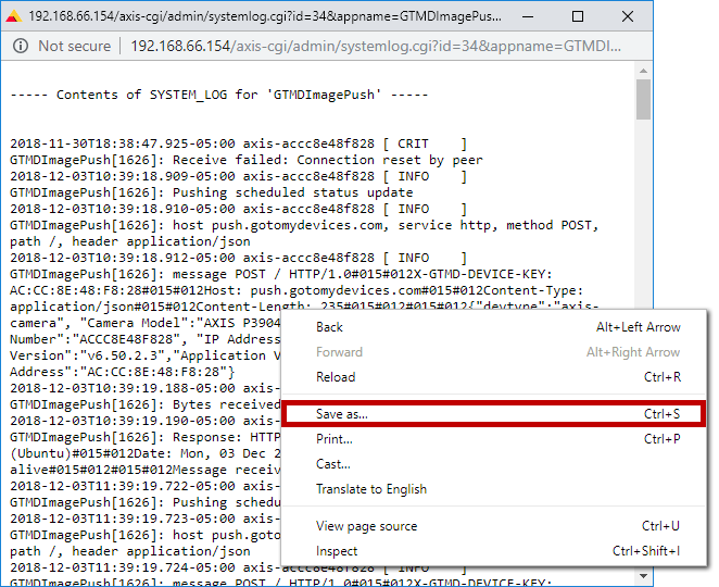 You may need logs from your Axis camera to troubleshoot an issue in your RoomAlert.com account or the Device ManageR software.