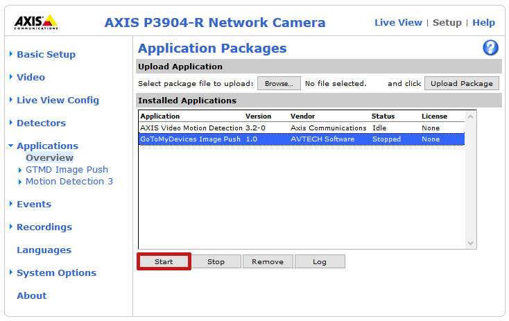 Your camera must have Video Motion Detection (VMD) 3.x installed. VMD 4 (or 2) is not compatible with our image push application.