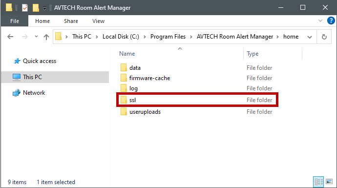 2. Navigate to Room Alert Manager’s installation folder on its host system. By default, it’s at C:\Program Files\AVTECH Room Alert Manager.