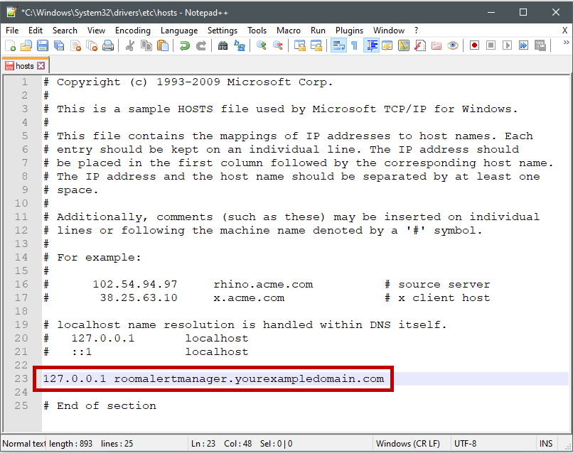 • In our example, we want our hostname to be “roomalertmanager.yourexampledomain.com” so we’re adding the following line to our hosts file: