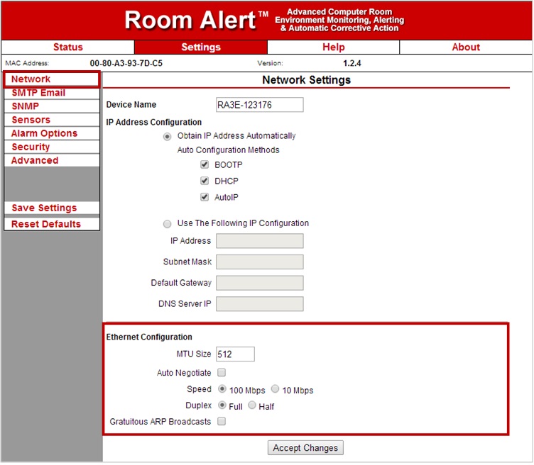 Another option that may mitigate the issue is to place a hub in between the Room Alert Monitor and the managed switch. This way, the Room Alert Monitor negotiates with the hub rather than the managed switch.