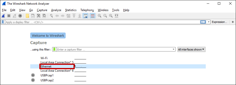 5. The Capturing from window appears with the Apply a display filter . . . field towards the top of the screen.