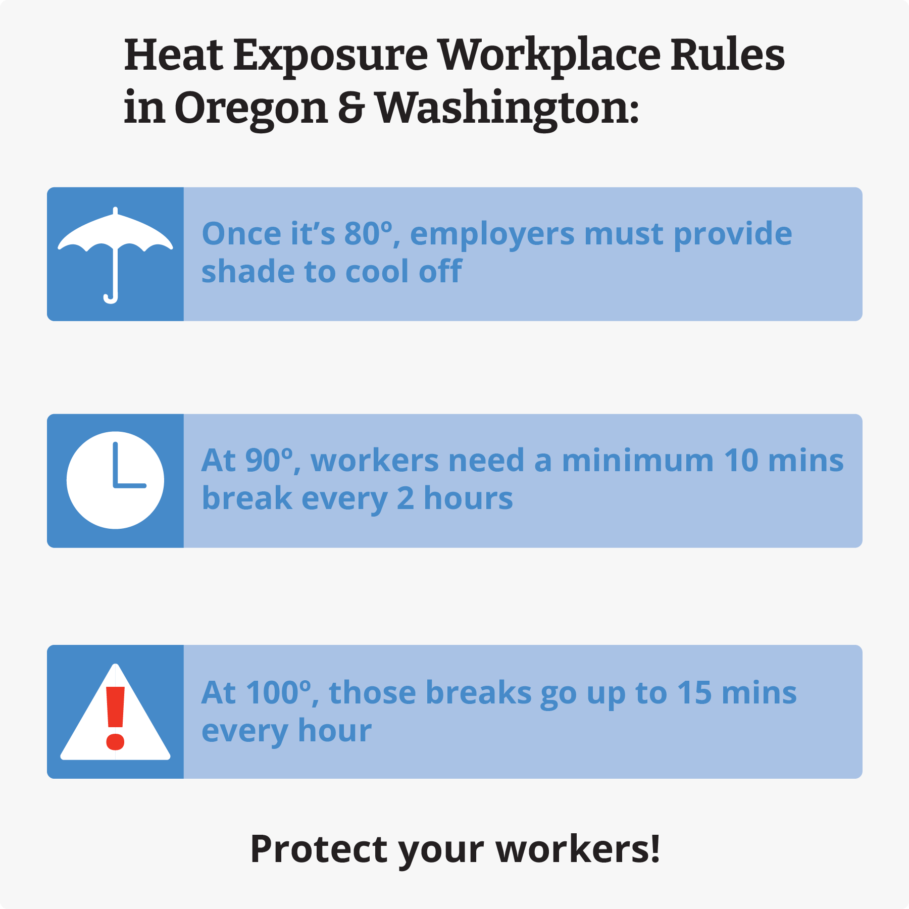 For employers in Washington, the Washington State Department of Labor and Industries (L&I) has established comprehensive regulations to protect workers from the hazards associated with outdoor heat exposure. These rules are designed to prevent heat-related illnesses and fatalities, and reduce traumatic injuries associated with heat exposure by outlining requirements for businesses to safeguard their workforce.