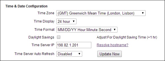 4. In the Time & Date Configuration section, enter the IP address of your time server in the Time Server IP field.