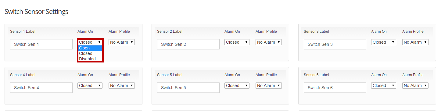 6. To generate an alarm (and change the Status page appearance to a red X) when the switch goes into an OPEN state, select Open from the drop-down list.