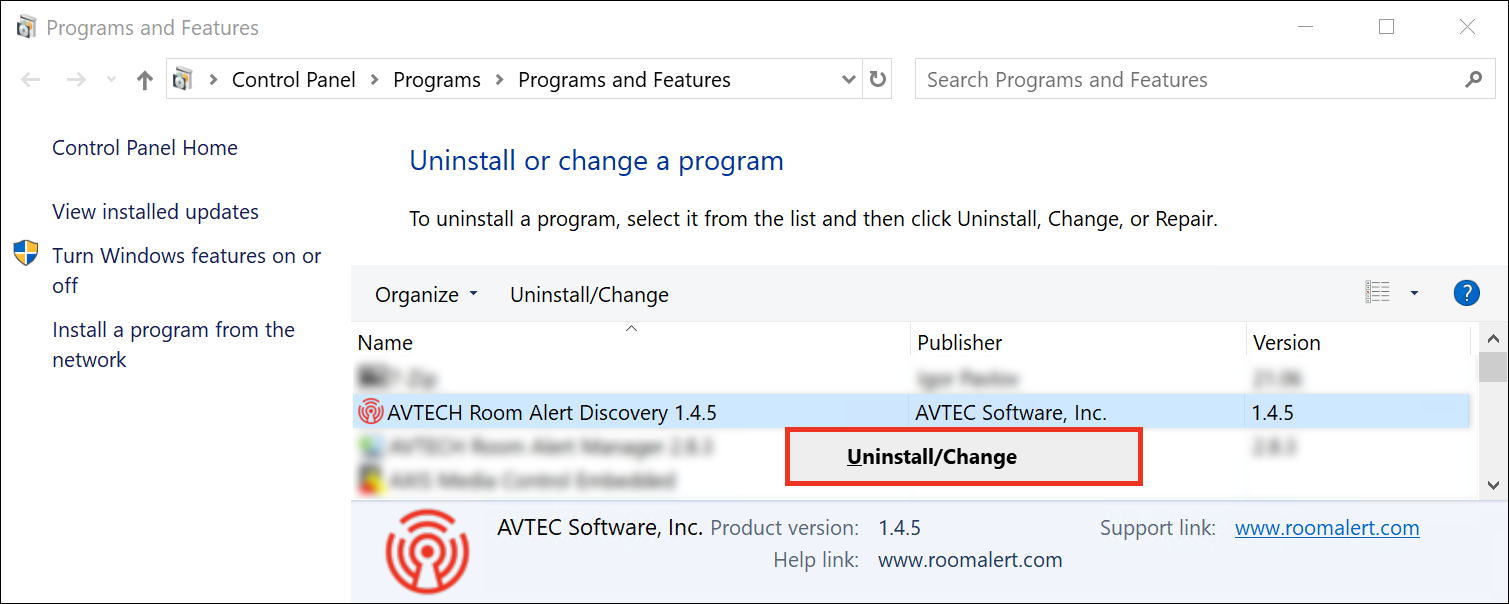 If you wish to remove the program, or you’ve been instructed to do so by Technical Support, you may uninstall Room Alert Discovery by following these steps. (Please note that it is typically not necessary to uninstall your old copy of Room Alert Discovery before you update – you may simply follow the instructions above.)