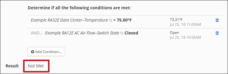 6. Once you add the second condition, a running Met/Not Met calculation displays in Result. Met displays only if all your conditions are true.