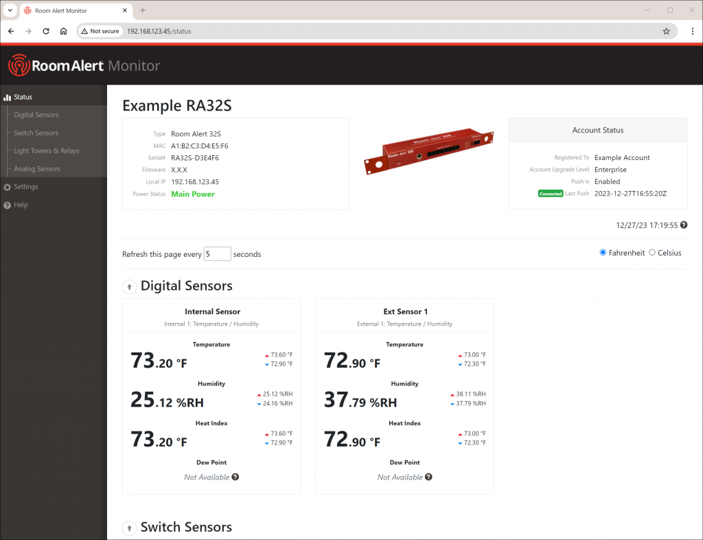 Your Room Alert Monitor has a built-in web interface. This interface is separate from the web interfaces for RoomAlert.com and Room Alert Manager software. Below you see an example of each: