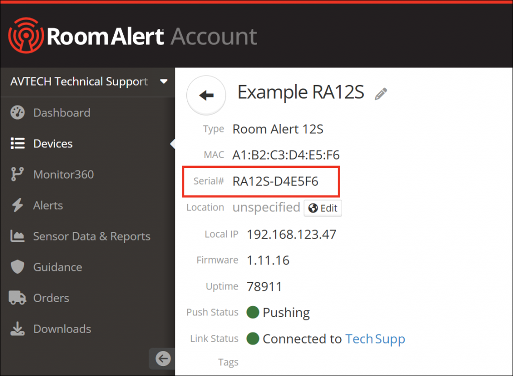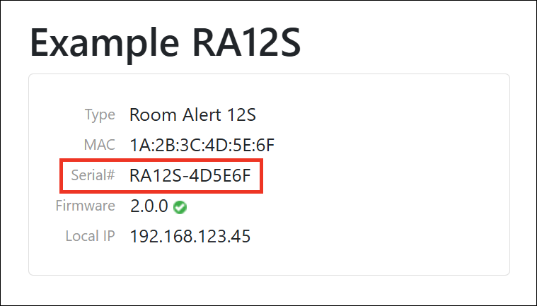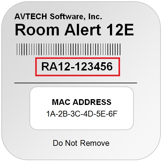 A Room Alert Monitor’s serial number is composed of a 3- to 4-character model code, a hyphen and either a 5- to 6-digit number or an alphanumeric string matching the last 6 characters of the MAC address.