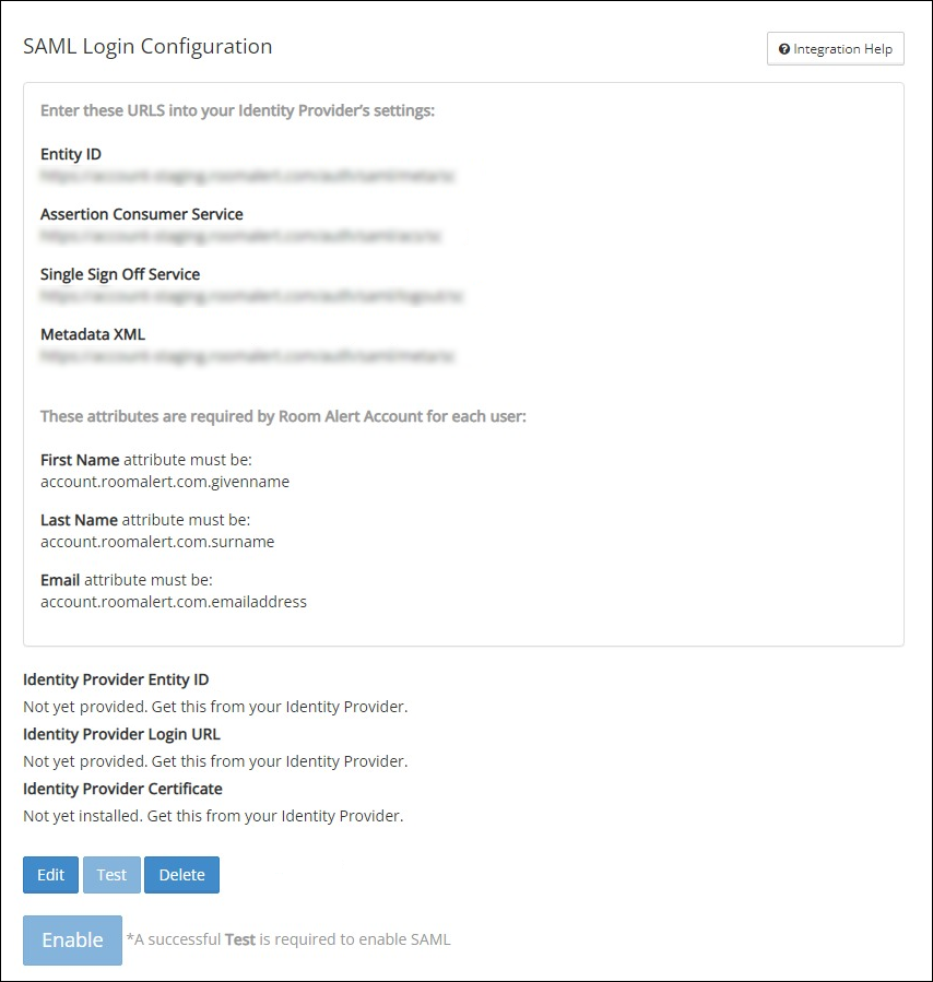 • If you edit your SAML configuration, you’ll need to perform a successful test again before you can re-enable SAML.