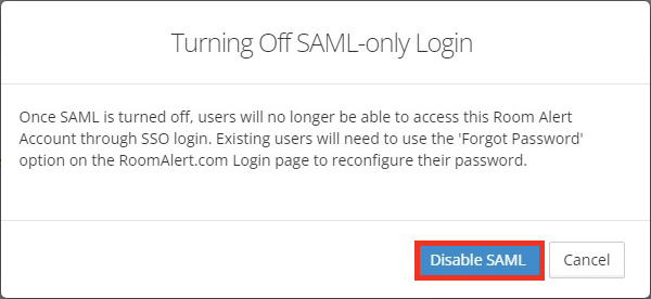 2. In the confirmation box, please read the message about user passwords, and then select Disable SAML.