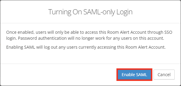 Any administrator or provisioner* can enable or disable SAML SSO in RoomAlert.com. This is a global account setting, meaning that when it’s enabled, all users on the account must use SAML authentication; users can no longer log in with a password. *For more information, please see the “Types of user roles” section of our FAQ, How To Manage User Access To Your RoomAlert.com Account.