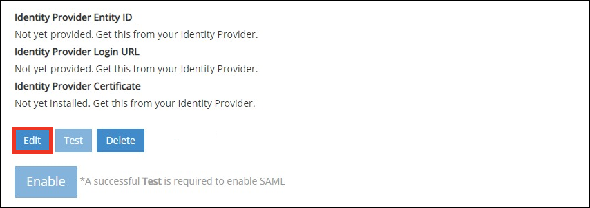 1. Once SAML has been disabled, the Edit, Test and Delete buttons become available.