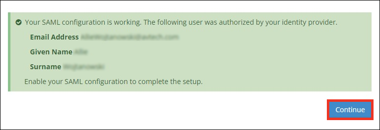 3. Confirm that the message contains the correct information for the user you’re currently logged in as. Then select Continue to return to the SAML Login Configuration form.