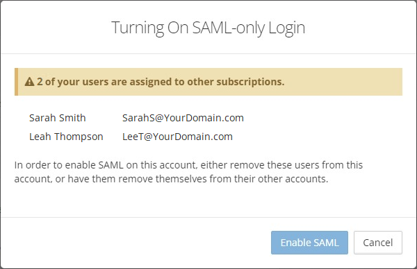 • After these users are removed, return to the form to enable SAML.