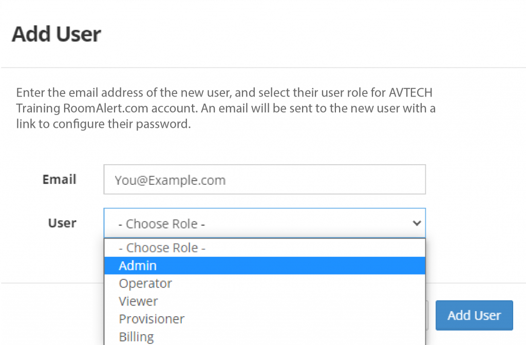There are five types of user roles: Administrator, Provisioner, Operator, Viewer and a Billing role. An Administrator has full access to all features and settings within Room Alert Account. Administrators can manage other registered users by granting/revoking their access to the account, as well as changing their user role on the account. An Administrator cannot change their own role; they can only be demoted by a different admin on the account.