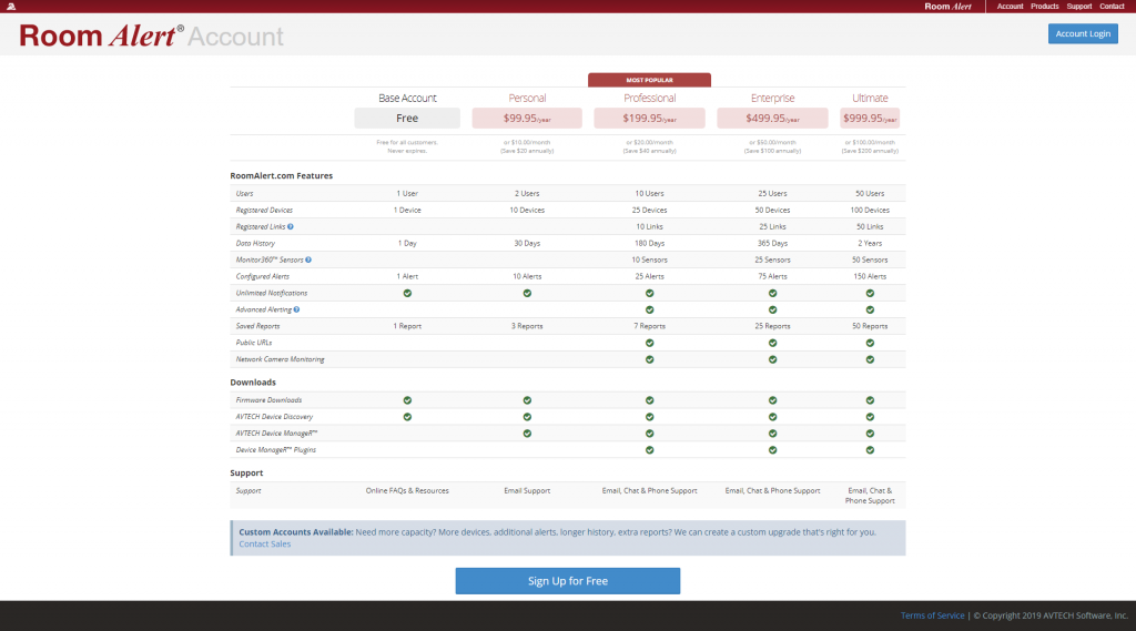 RoomAlert.com offers many features depending on what account level best suits your business. We have various account tiers that provide up to 2 years of data history at our Ultimate level. Here at AVTECH, we acknowledge that some situations may call for more than 2 years of data retention which is why we also offer additional levels to help support all of our customers. This allows you to purchase more data capacity, which is perfect if you’re trying to register more devices, create additional custom alerts, retain longer data histories and/or receive extra reporting.