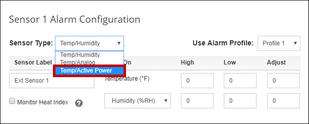 If you connect a Temperature & Analog sensor, Temperature & Active Power sensor or Temperature & Air Flow sensor to your Room Alert Monitor, you must manually set its Sensor Type; otherwise, the sensor type is set to “Temperature / Humidity” by default.