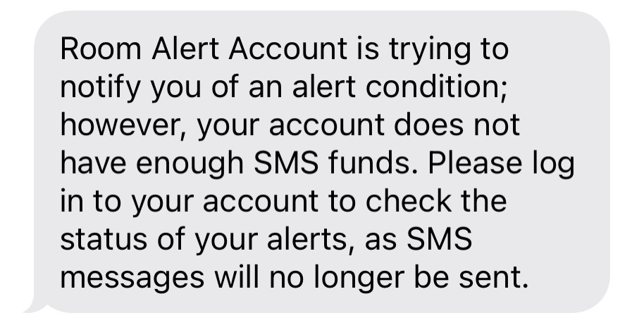 If your organization’s Room Alert Account has been upgraded to the Professional level or higher, you may send SMS notifications to members of your team in response to alert conditions. To use this feature, SMS funds must first be added to your account; each time an SMS message is sent, the cost gets deducted from these funds. (Room Alert will let you know if funds are low or depleted, so you don’t miss anything.)