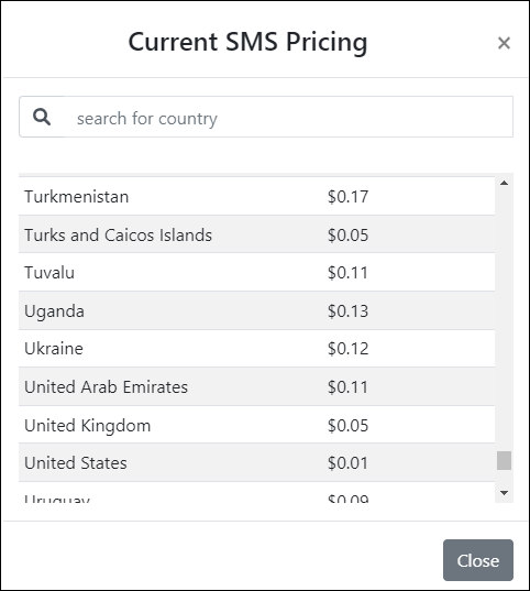 Click on Current SMS Pricing to check the cost of sending an SMS message. (The price varies by country and is subject to change.)