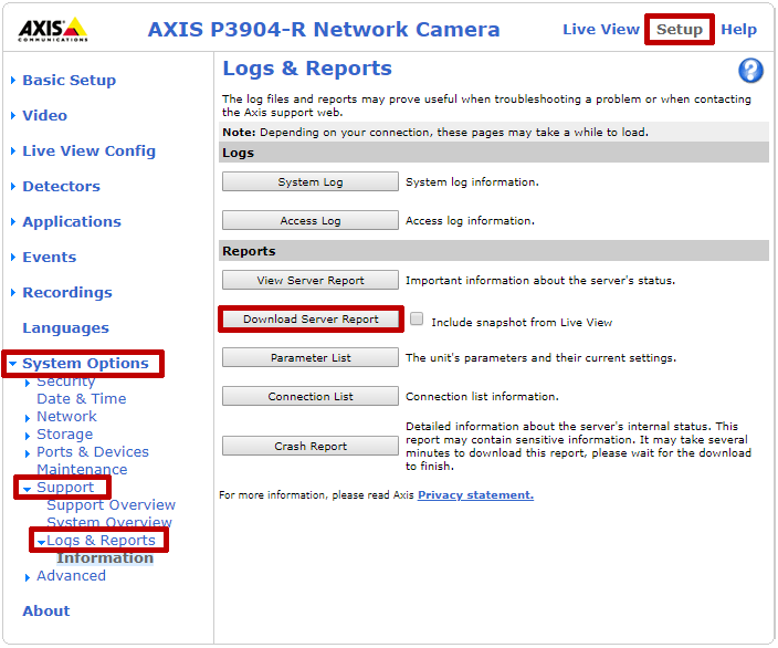 Follow the instructions below to navigate to the log(s) and server report. How you get to them depends on your camera’s firmware version range.