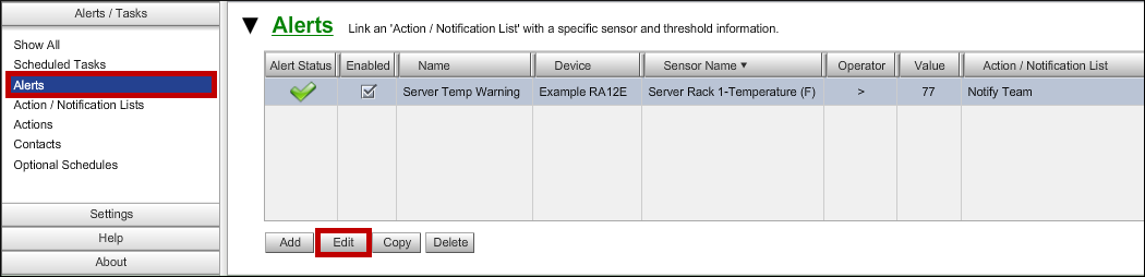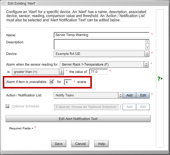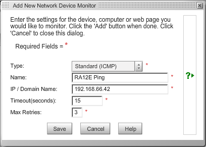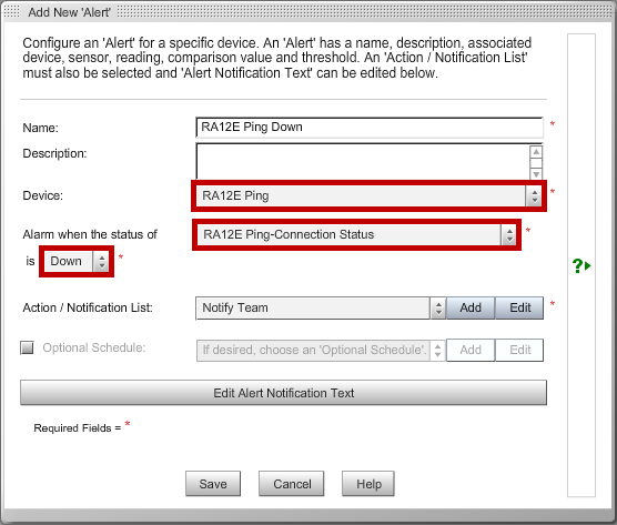 There are three different ways to configure Device ManageR to notify you if one of your Room Alert Monitors goes offline.