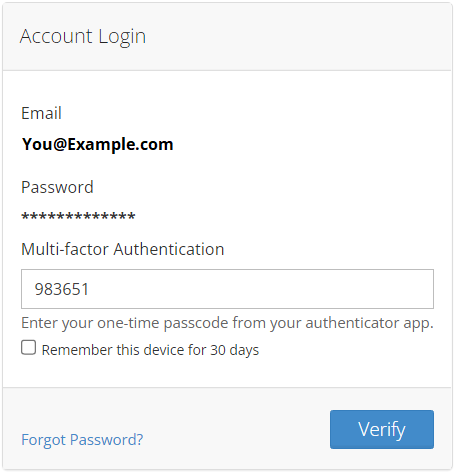 - You may bypass the MFA step on trusted devices by selecting Remember this device for 30 days during the login process.