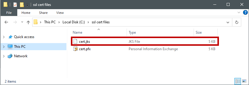 The JKS file must be named: cert.jks. Please rename the file when you save it to this folder, if needed.