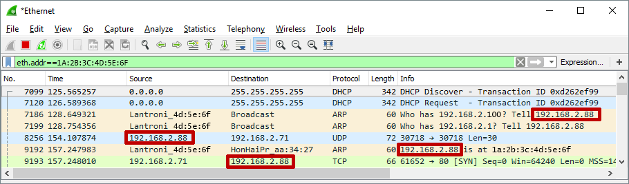 – This screenshot from Wireshark shows the Room Alert (on DHCP) first booting up on its regular network. You can see its IP address is 192.168.2.88, which shows up in several places in the capture.