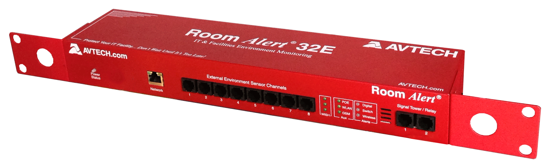 All of our Room Alerts allow users to plug in a combination of external sensors, which can monitor a variety of environment factors some distance from Room Alert. The Room Alert 32E can have up to 8 external digital sensors attached to it, including sensors such as: