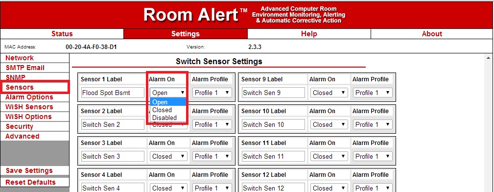 Switch sensor ‘Alarm On’ states are set to ‘Closed’ by default in your Room Alert Monitor web interface. Click here to check if your switch sensor should be set to ‘Alarm On’ ‘Open’ or ‘Closed’.