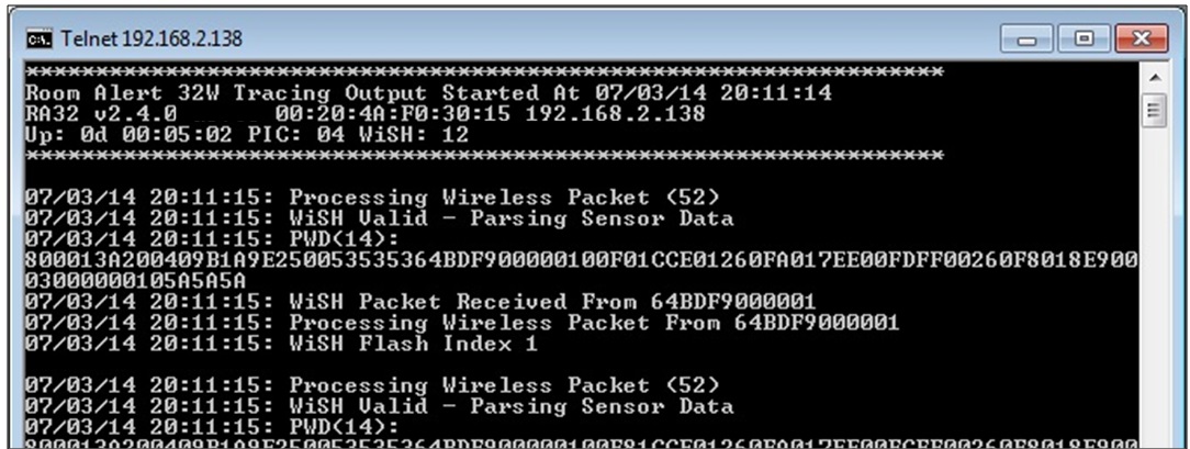 In the example shown below, the IP address of the Room Alert is 192.168.2.138; the trace port number is the default, 143.