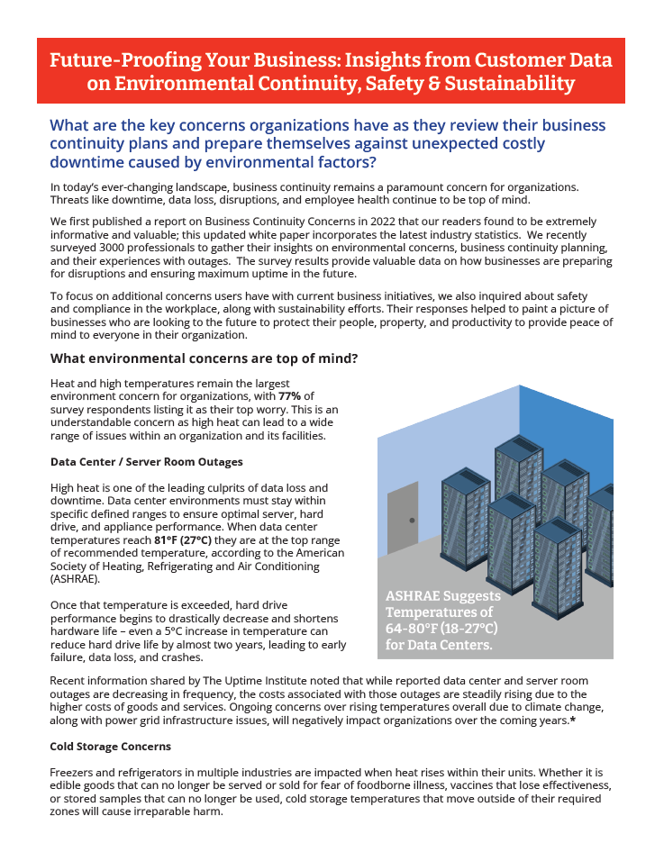 Our latest white paper “Future-Proofing Your Business: Insights from Customer Data on Environmental Continuity, Safety & Sustainability” is based on a survey of 3,000 professionals, and dives deep into today’s top business continuity concerns. We explore: