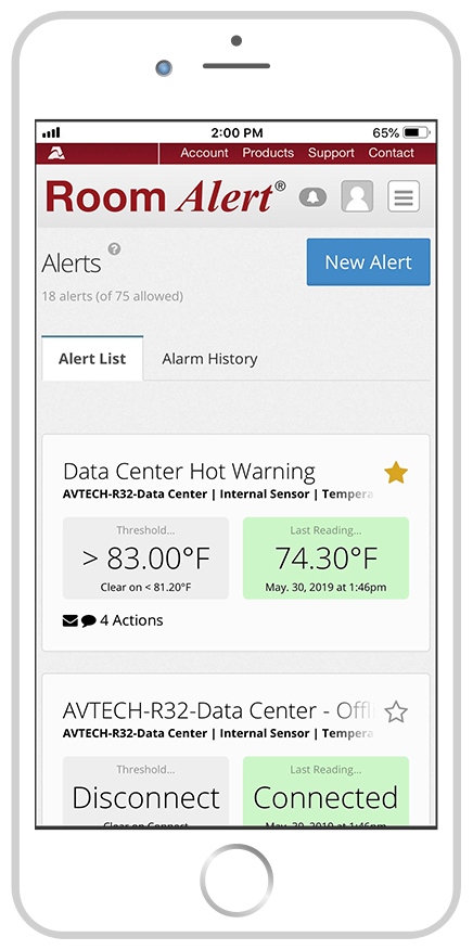 Accessing your Room Alert Account portal from your phone also allows you to access all of the features our patent-pending Monitor360 technology provides, including virtual sensors, advanced alerting and more.