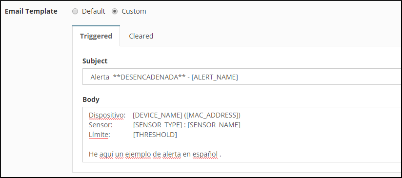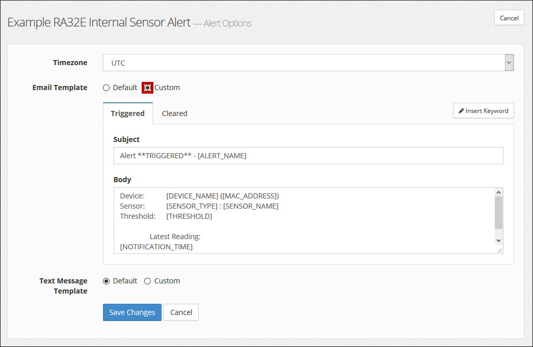 Customizing an alert is as easy as going to the Alert Options in the Room Alert Account dashboard, clicking the Custom radio button as shown below, and entering any new text you’d like for both Triggered Alerts as well as Cleared Alerts.