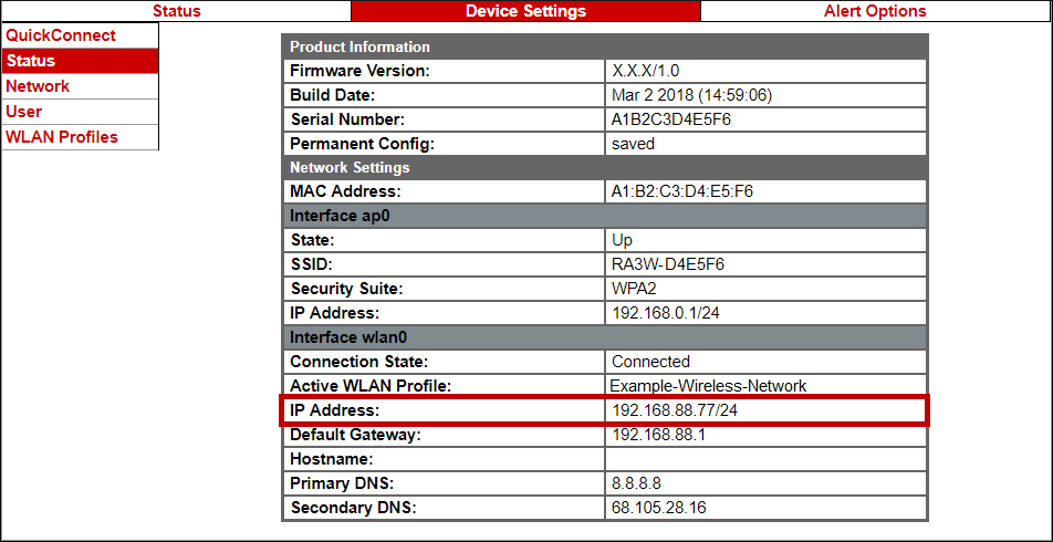 – You can now check the Room Alert 3 Wi-Fi’s IP address by navigating to Device Settings –> Status.